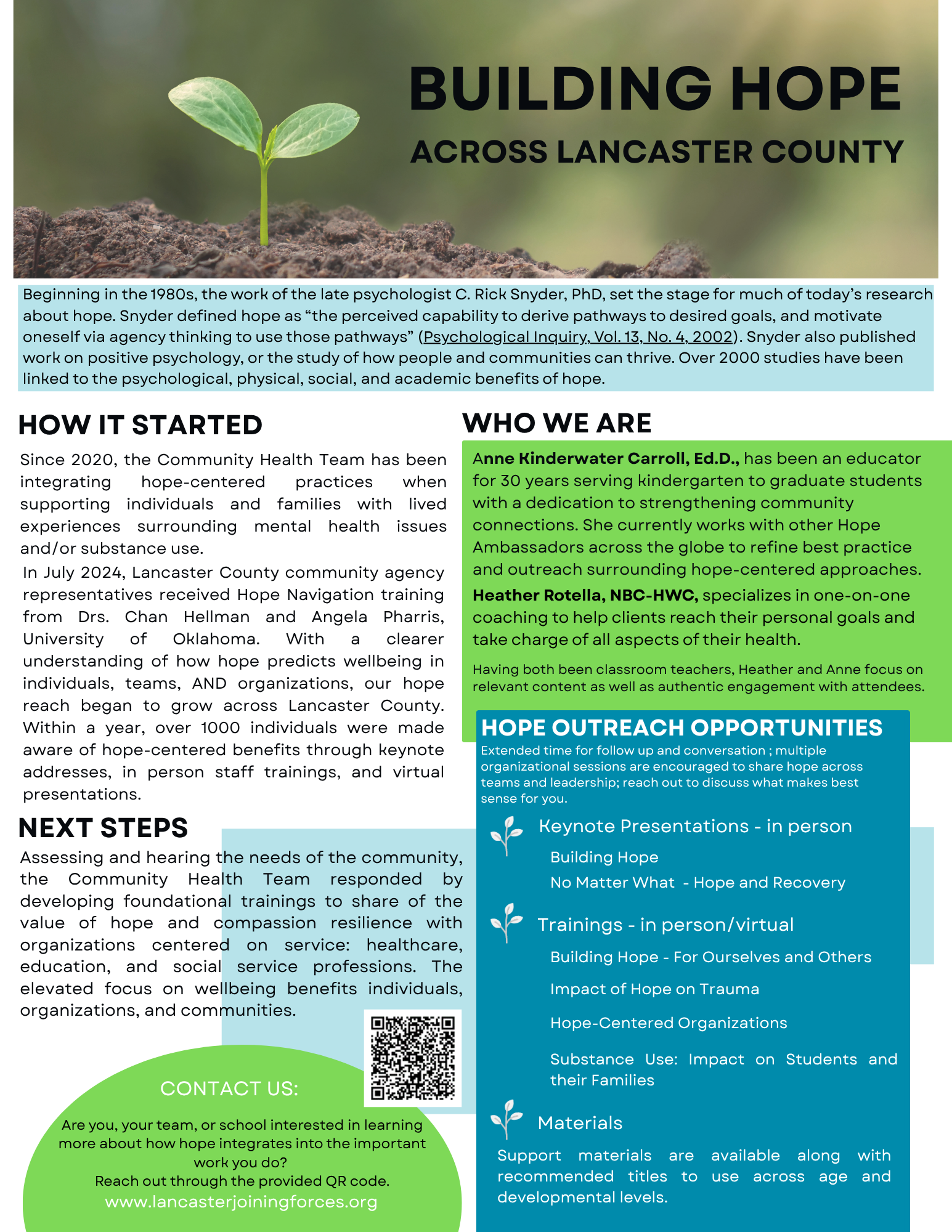 - Providing evidence-based, hope-centered approaches and resources to individuals, families, and/or caregivers